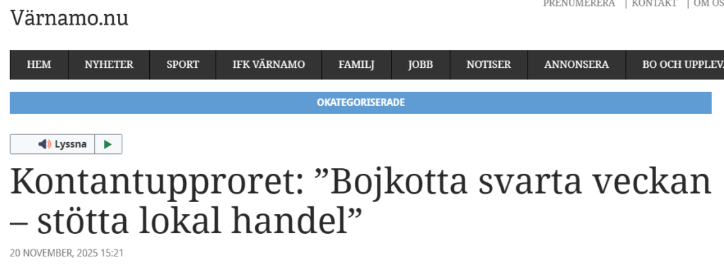 Värnamo.nu skriver om kampanjen och initiativtagarnas uppmaning till allmänheten att stödja lokalsamhället under Black Week. Läs artikeln HÄR