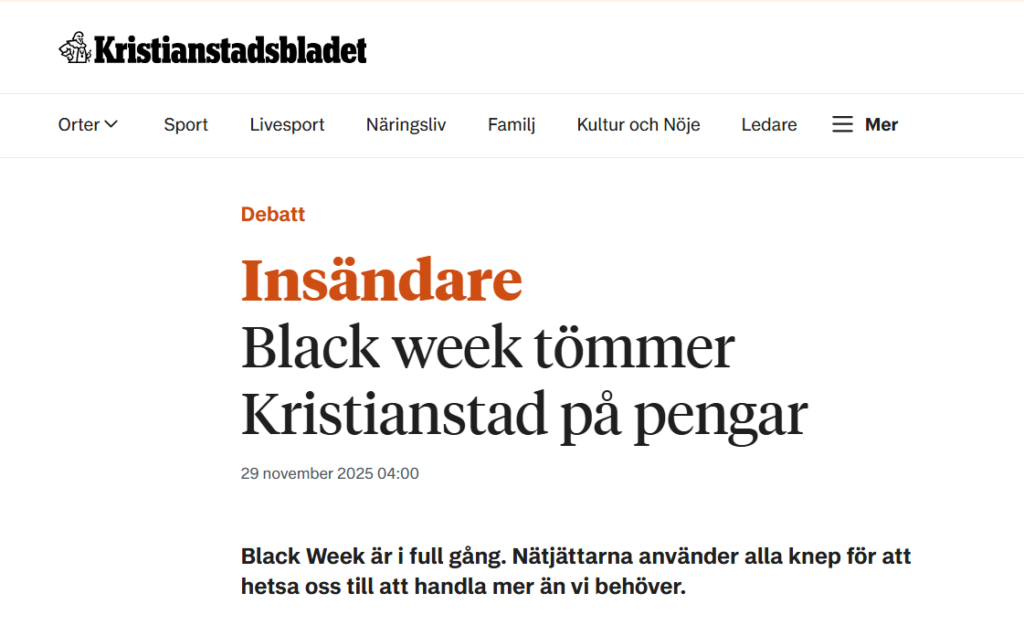 Black Week är i full gång. Nätjättarna använder alla knep för att hetsa oss till att handla mer än vi behöver. Läs artikeln här.